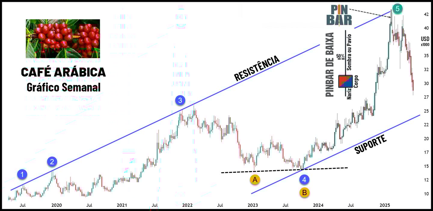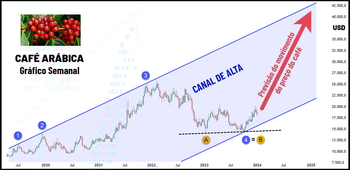 O cafezinho nosso de cada dia está mais caro. Nos últimos anos repetidas secas prejudicaram a oferta global de café, frequentemente alterando os preços. As mudanças climáticas fizeram o mesmo com o cacau, azeite de oliva e suco de laranja. Segundo a CNN Brasil, os preços do café arábica passam por alta desde 2024 (veja abaixo a manchete de uma reportagem), após safras terem sido prejudicadas por adversidades climáticas, como restrição hídrica e altas temperaturas nas fases de floração, que impactaram a produtividade. Ao mesmo tempo, a demanda global por café continua aumentando. A Lei da Oferta e Procura foi citada pela primeira vez por Adam Smith, no século 18. Smith afirmava que o preço de um produto ou serviço é determinado pelo equilíbrio entre a quantidade oferecida pelos produtores e a quantidade procurada pelos consumidores. Logo, se a oferta de café diminuiu e a demanda aumentou era fácil prever que o preço do café aumentaria por consequência direta desta lei, porém, muito mais importante do que apenas saber que o preço vai subir é saber ATÉ ONDE vai subir, e é somente a análise técnica PURA (a verdadeira Análise Técnica utilizada pelos big players dos mercados) que tem a resposta a essa pergunta! Aceita que dói menos!!! O exemplo da imensa beleza e poder da verdadeira Análise Técnica que veremos a seguir encaixa-se perfeitamente no estilo do gestor bilionário Paul Tudor Jones II, que é baseado primeiramente em Análise Técnica, sendo o oposto de value investing, com uma ênfase em fatores momentâneos que direcionam os mercados. É dele a famosa frase: “Sempre acredito que os preços se movem primeiro e os fundamentos vêm depois”. Veja abaixo o gráfico, onde o preço do café iniciou esta última alta no final de 2023.