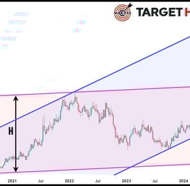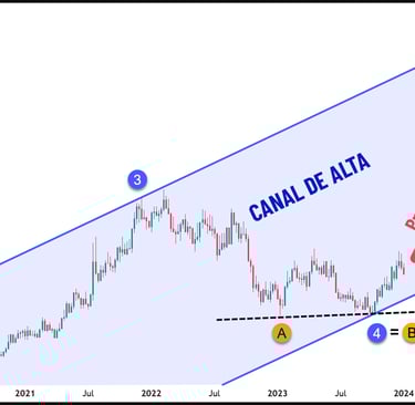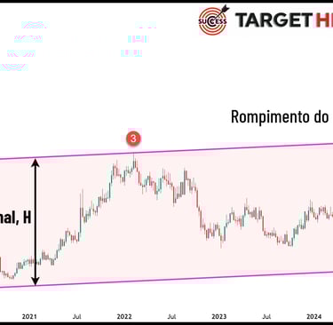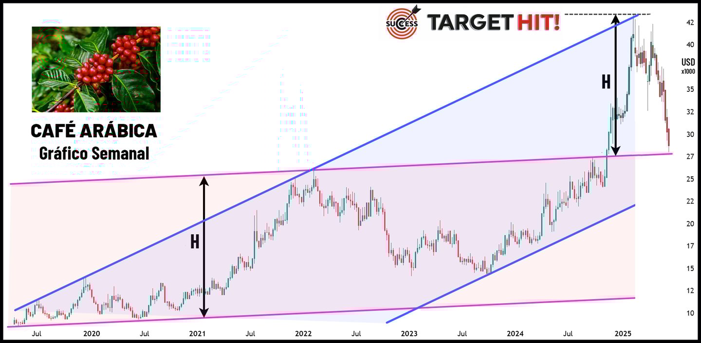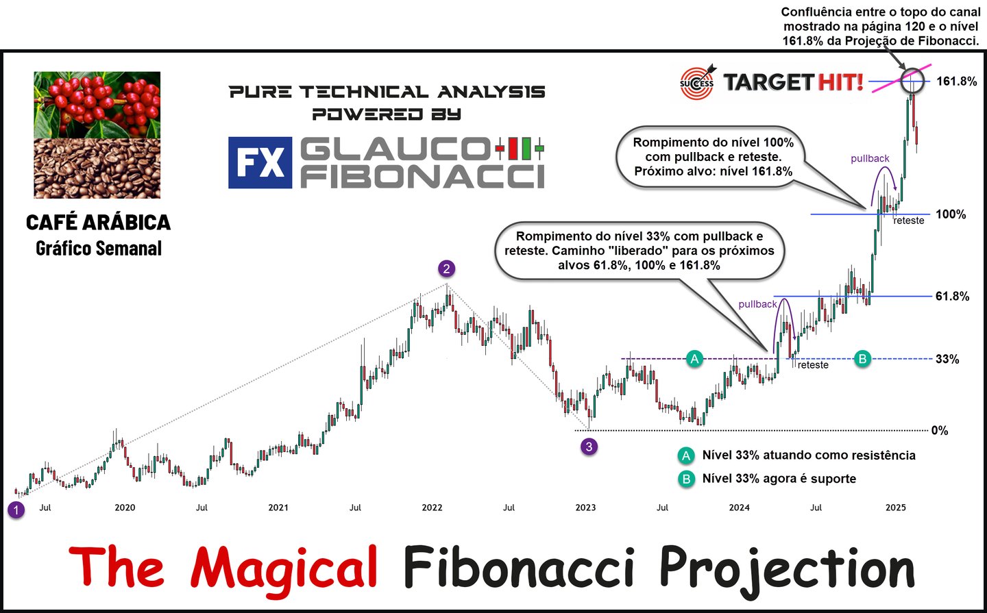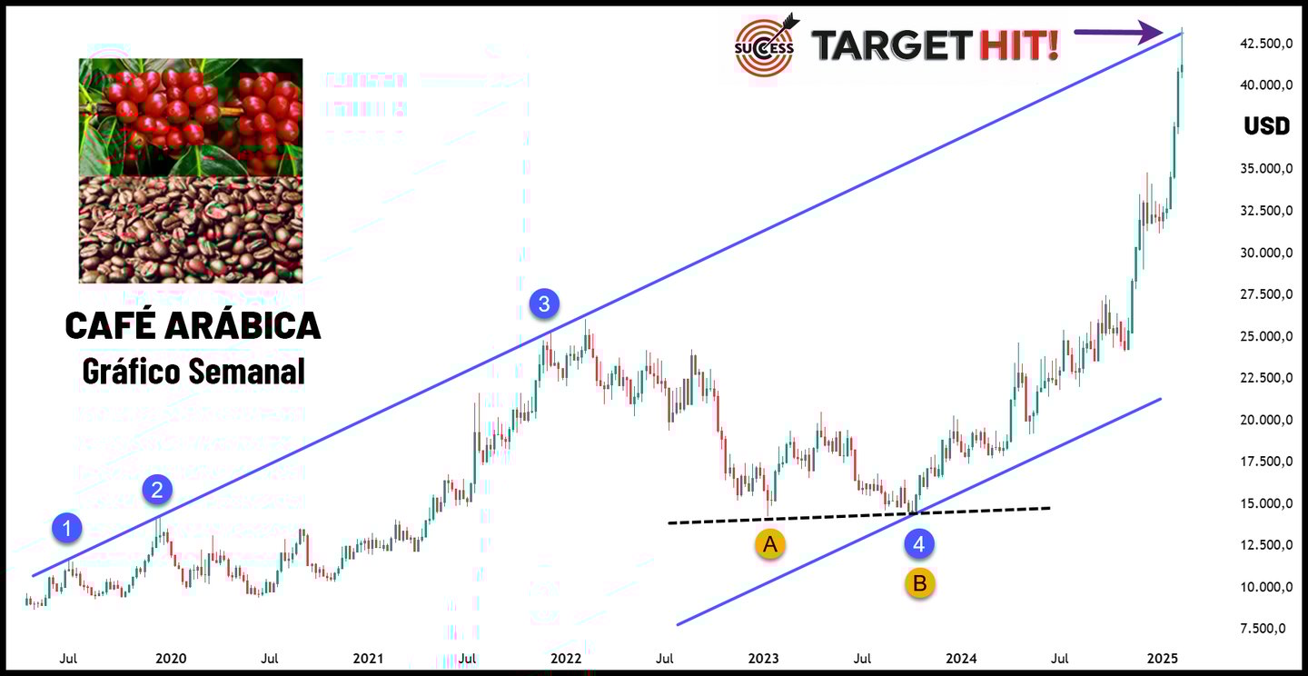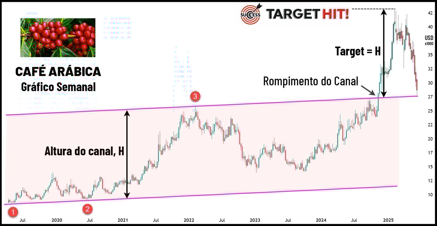 Sendo determinado o canal de alta na figura 2, o próximo objetivo ou alvo do preço do café será o topo deste canal. Se você passou anos a fio procurando uma “bola de cristal” para prever o movimento do mercado, você acabou de encontrar uma delas: o canal paralelo. E veja na figura 3 abaixo o que aconteceu com o preço do café. Os traders profissionais e os algoritmos dos big players que movem os mercados financeiros agiram em massa e levaram o preço ao seu alvo no topo do canal. Entre outubro/2023 (fundo do canal, ponto 4) e fevereiro/2025 (topo do canal) o preço do café aumentou 200%.
