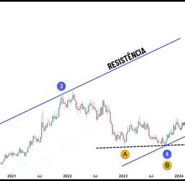 Vamos traçar um canal neste gráfico. Como você aprendeu neste capítulo, para traçar um canal são necessários no mínimo 3 pontos. Veja no gráfico abaixo os pontos escolhidos (1, 2, 3 e 4) e o canal traçado. Escolhemos o ponto 4 para traçar o fundo desse canal após o preço formar um fundo duplo (pontos A e B), como você pode ver claramente na figura 2.