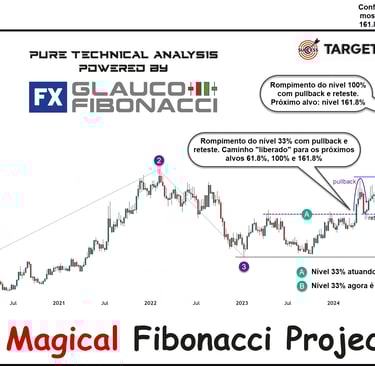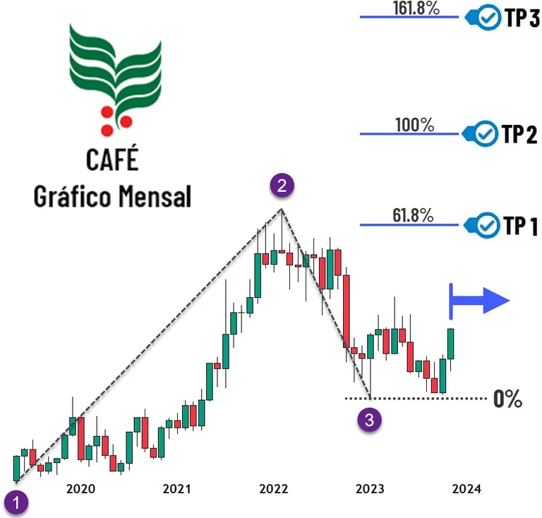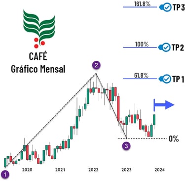 Imaginemos que no final de 2023 e início de 2024 você se deparou com o gráfico do preço do café arábica mostrado ao lado. Como você faria para prever o preço do café? Muito simples. Vamos traçar uma projeção de Fibo neste gráfico. Como você aprendeu neste capítulo, para traçar uma projeção de Fibonacci são necessários 3 pontos de ancoragem. Veja na figura os pontos escolhidos (1, 2, e 3) e a projeção traçada com os respectivos alvos do preço do café. Agora veja o resultado final na página ao lado e testemunhe a imensa beleza da verdadeira Análise Técnica!
