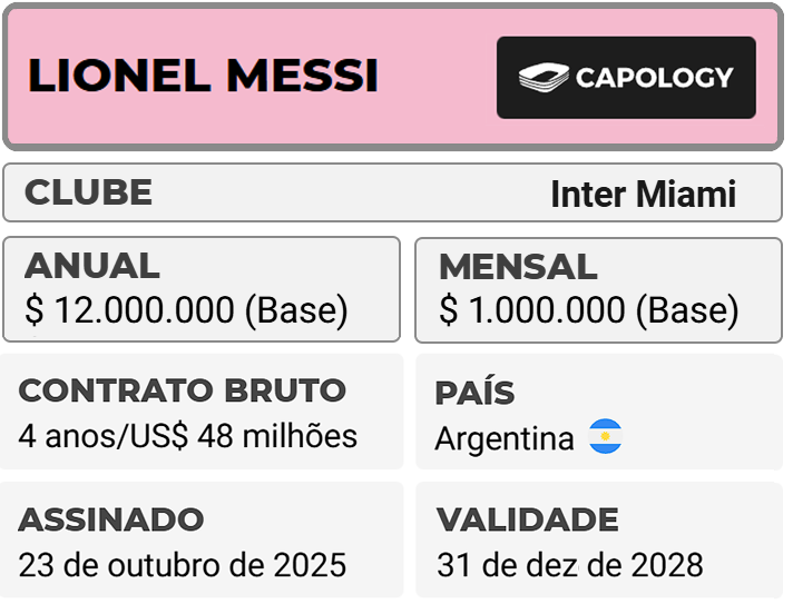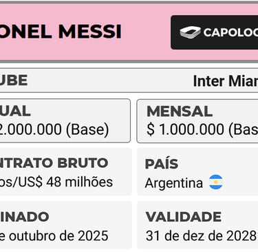 Lionel Andrés Messi Cuccittini (Rosário, 24 de junho de 1987) é um futebolista argentino que atua como atacante e no presente ano de 2025 defende o Inter Miami. Como capitão da Seleção Argentina, venceu a Copa do Mundo do Catar de 2022. Messi detém o recorde de 8 premiações da Bola de Ouro pela France Football, 8 títulos de melhor jogador do mundo pela FIFA, 2 Prêmios Laureus de melhor esportista, além de 6 Chuteiras de Ouro da Europa e, com 46 títulos coletivos conquistados, é o jogador com mais títulos oficiais na história do futebol. De acordo com o site capology.com especializado em salários de atletas, Messi recebe 12 milhões de dólares brutos anuais no Inter Miami, ou um US$ 1.000.000,00 (um milhão de dólares americanos) por mês. Evidentemente, se considerarmos os bônus, os patrocínios milionários de grandes empresas e o merchandising nas redes sociais, Lionel Messi ganha por mês muito mais do que isso.